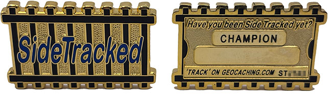 The SideTracked Limited Edition Geocoin was launched in October 2008. It comes in two metals, Gold ("Champion") of which only 90 were produced with a few variants (see below) and a Extra Limited Edition version of which only 20 were produced, in Copper.